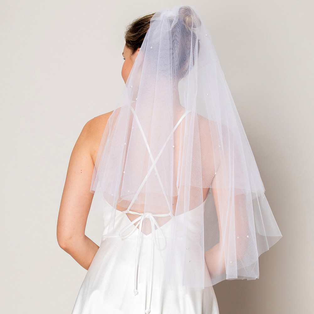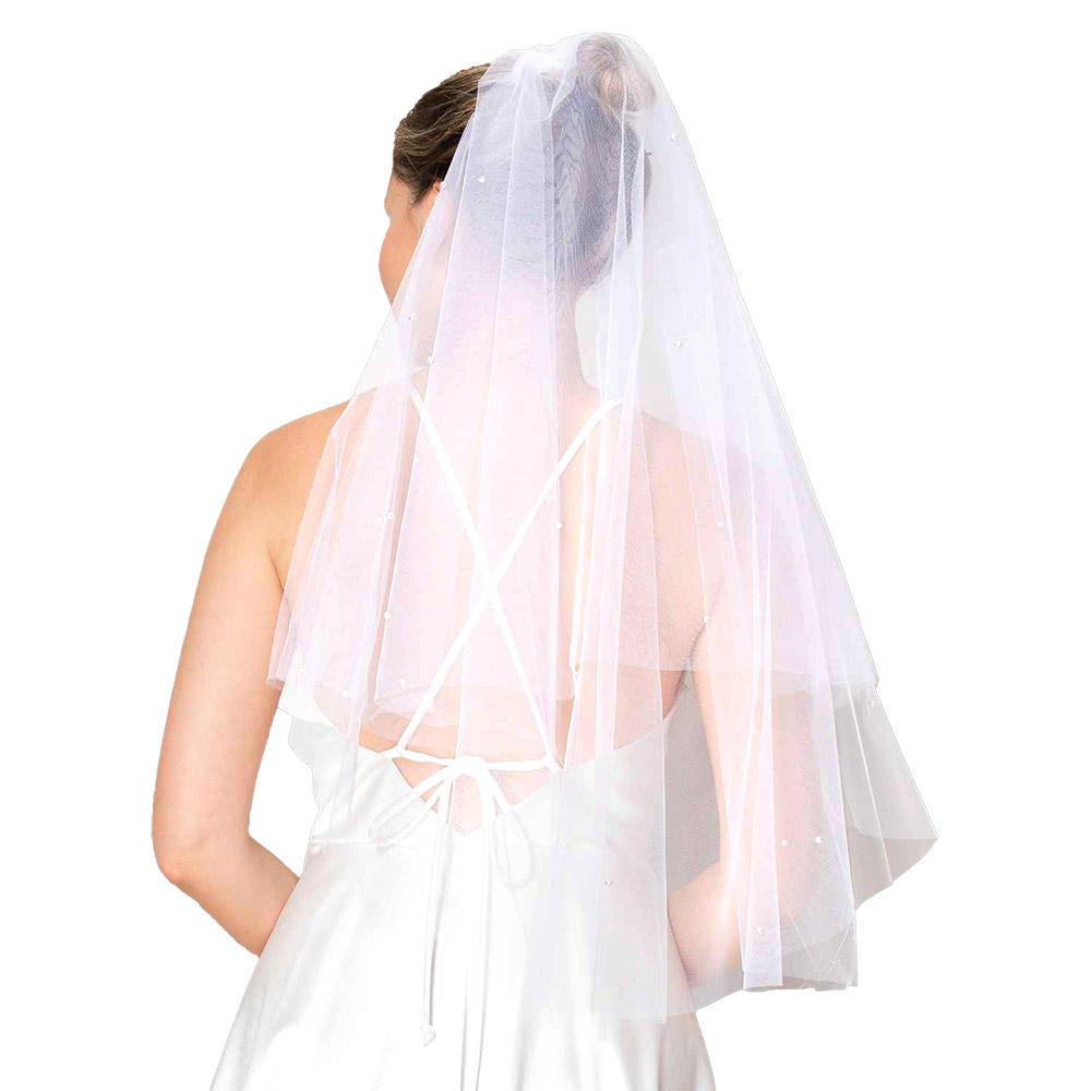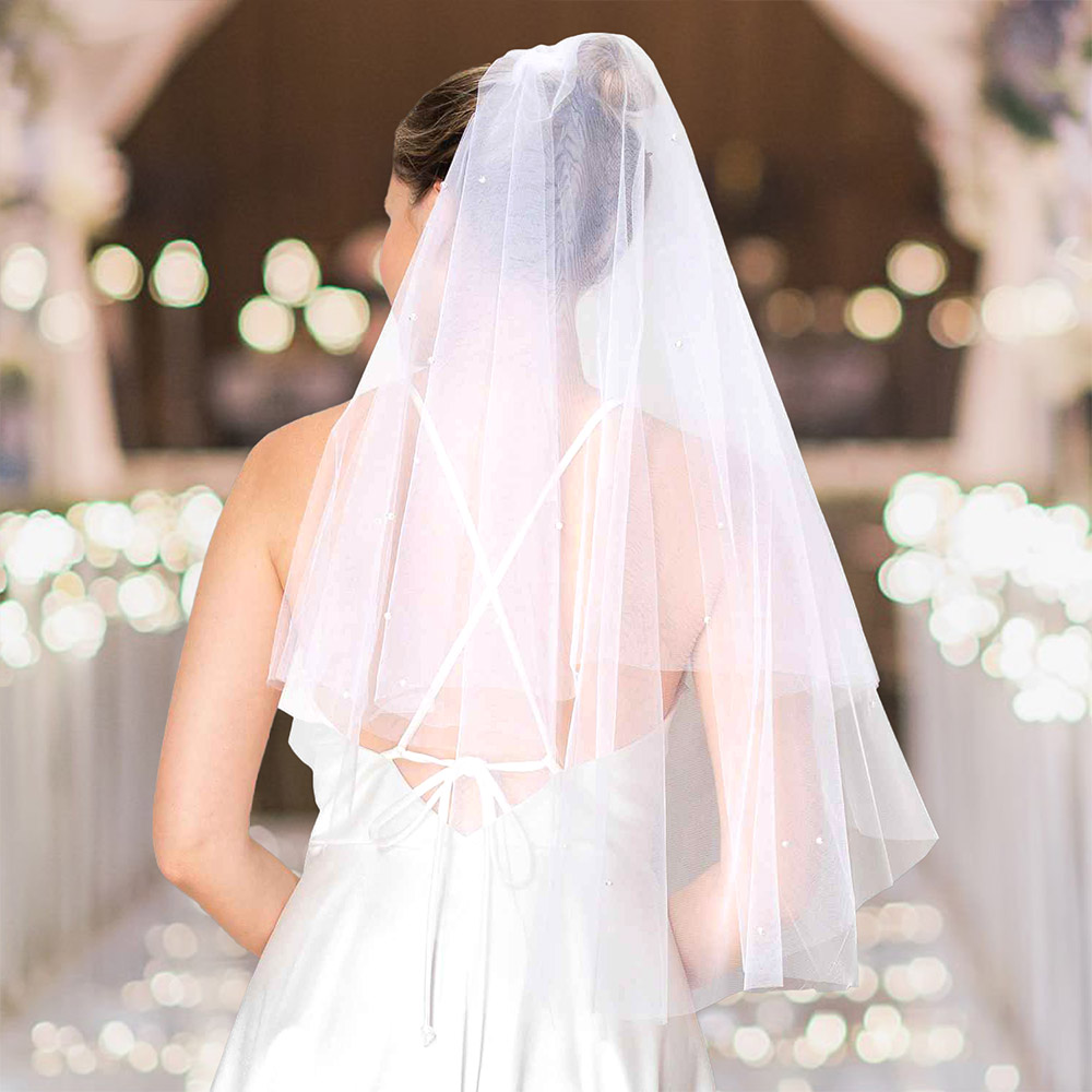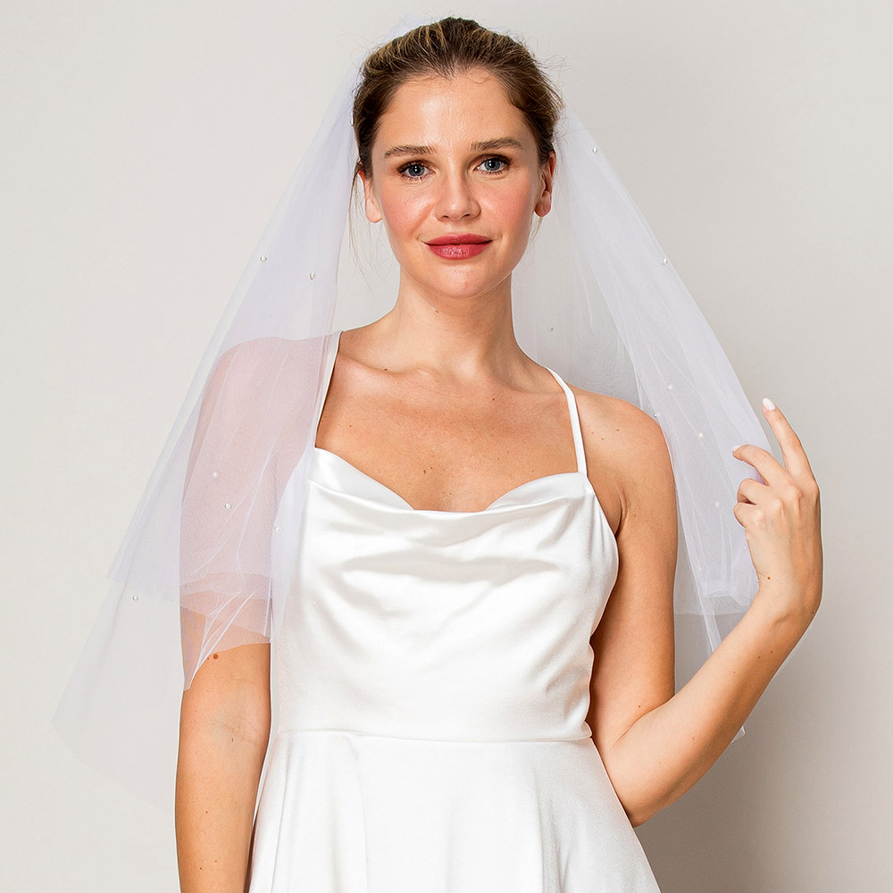 Details • Length : 30" L • This stunning two-tier bridal veil features delicate pearl accents scattered throughout the soft, sheer tulle. The short length and layered design offer an elegant, sophisticated look for the modern bride. Ideal for brides who want to add a touch of timeless beauty to their wedding day ensemble, this veil effortlessly enhances the bridal gown without overshadowing it.