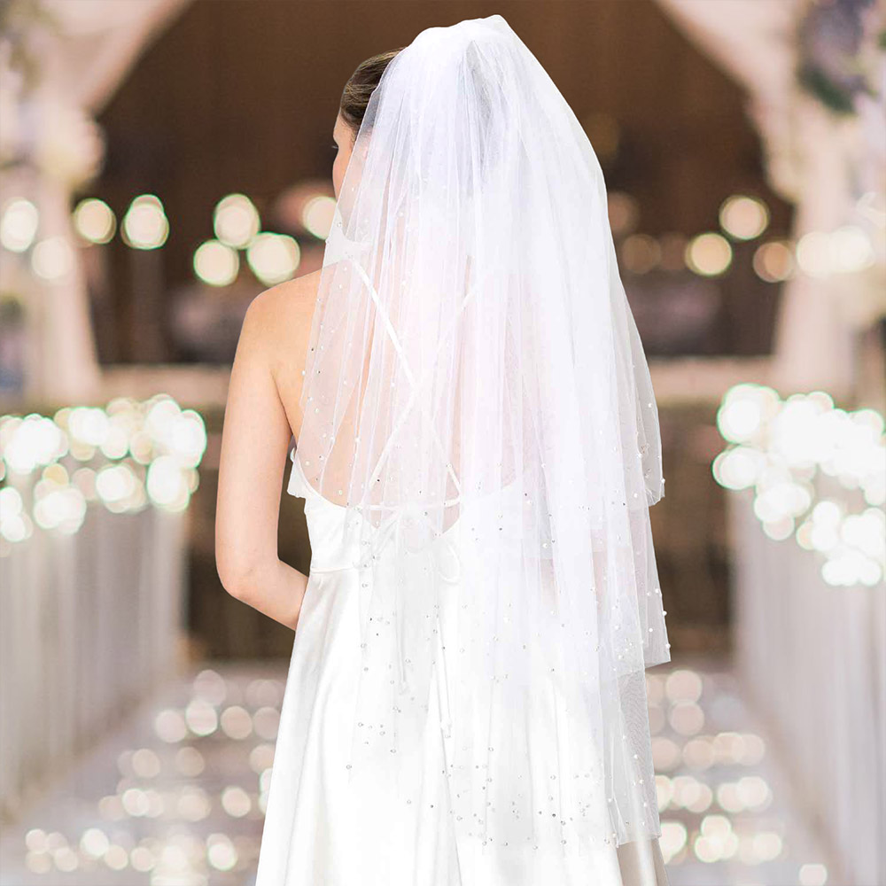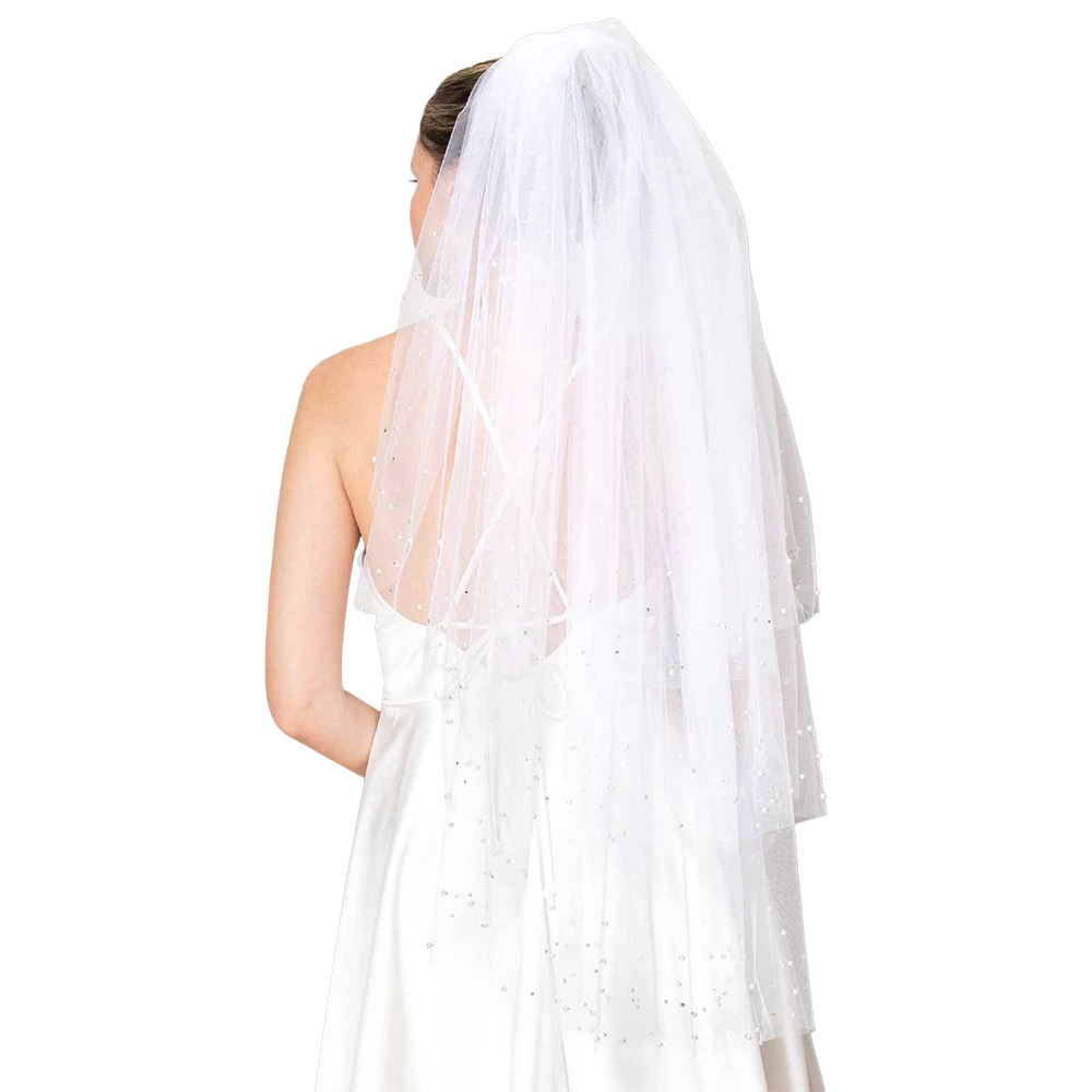 Details • Length : 38" L • This exquisite three-tier bridal veil features delicate layers of soft tulle, embellished with elegant pearl accents throughout. Perfect for brides seeking a timeless, romantic look, this veil will beautifully complement your wedding gown and add a touch of sophistication.